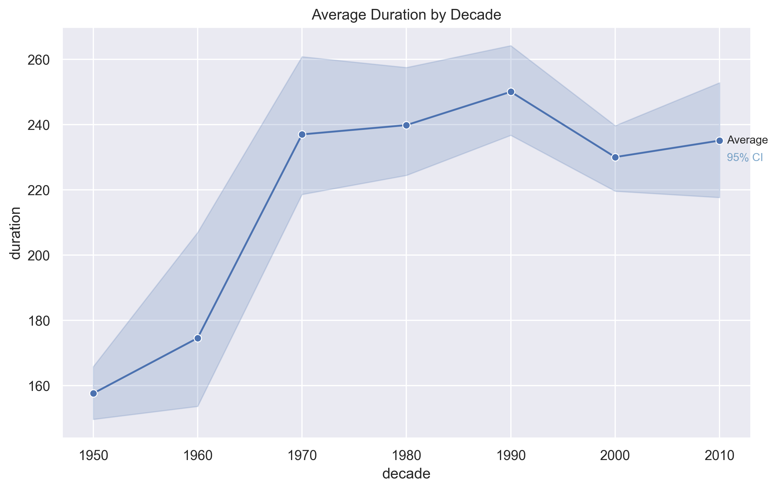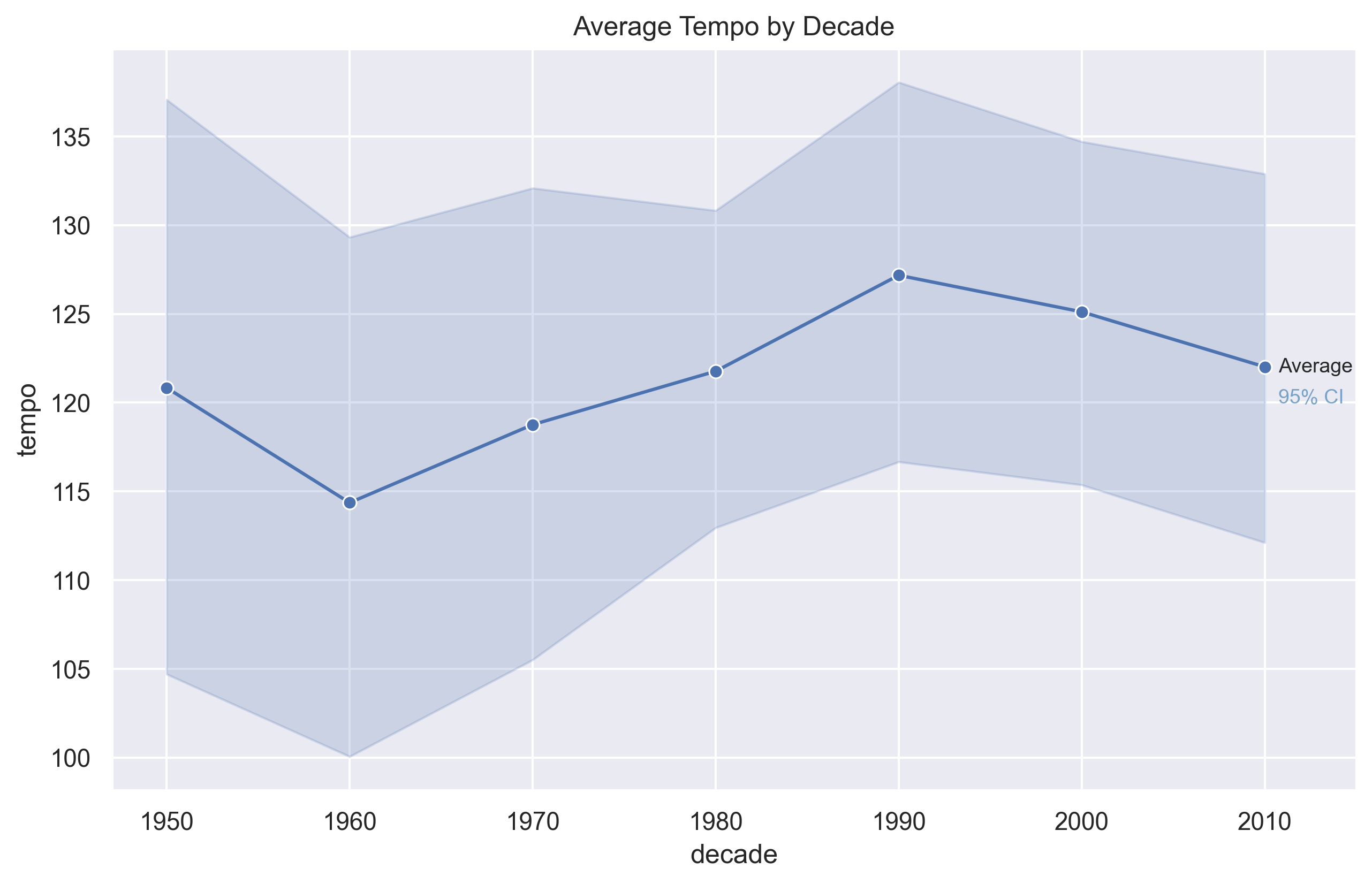 Average tempo rises from the 1950s through the 1980s, peaks around the 1990s, and then declines slightly in the 2000s and 2010s. This suggests that modern hits are not necessarily faster than songs from earlier peak decades.