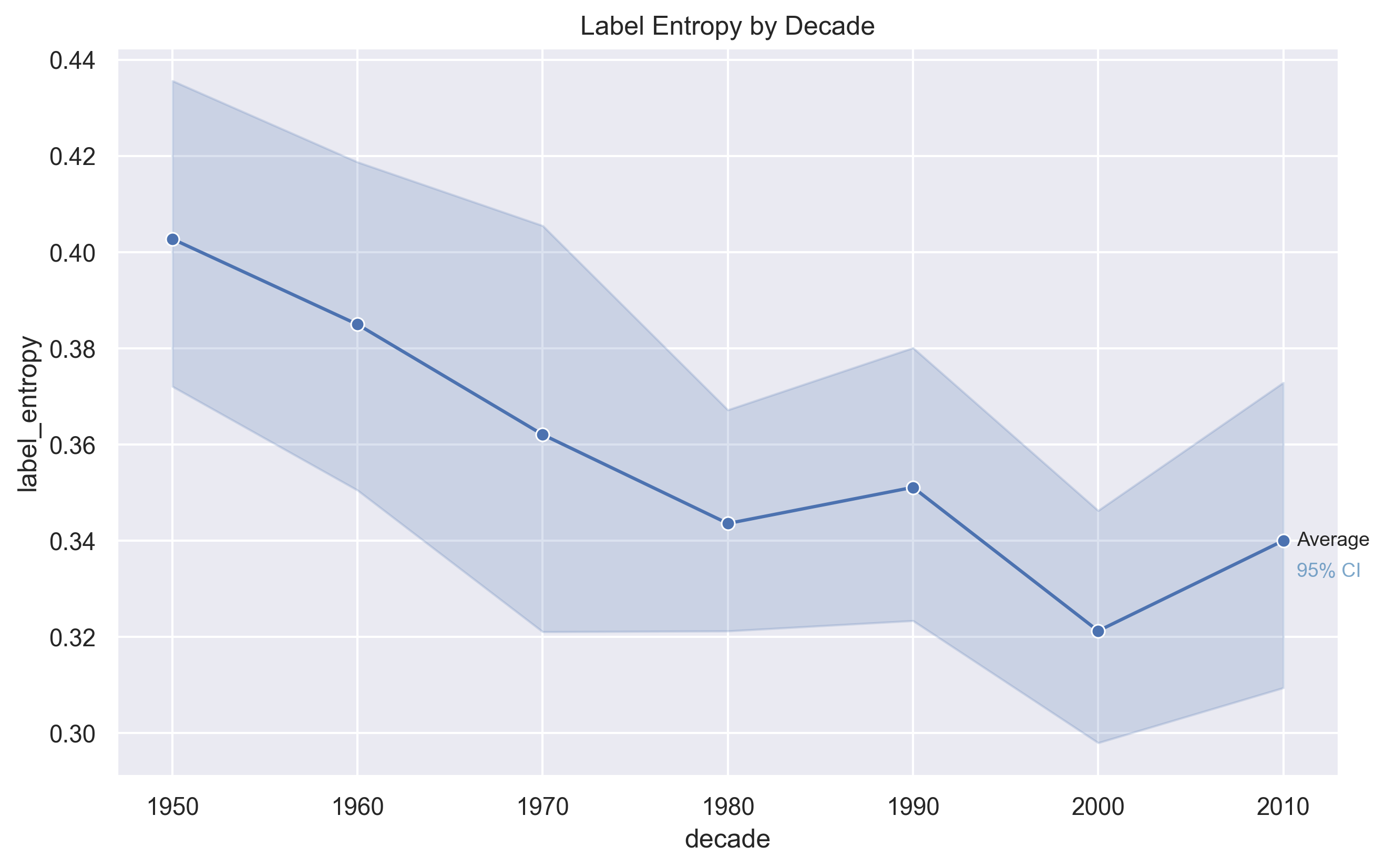 After sectioning the song, to get label entropy, MSAF determines how evenly the song's different types/sections are spread across the length of the song. Low entropy means the song has a similar type across the whole runtime, and high entropy means there's much variability. Segment variability measures how evenly different structural sections are distributed within a song, indicating how repetitive or structurally diverse its overall form is. Segment variability declines steadily from the 1950s through the 2000s, suggesting that modern songs tend to rely more heavily on repeated section patterns. This indicates a gradual shift toward more predictable and repetitive song structures over time. A study published in Scientific Reports found that contemporary popular music exhibits increasing homogenization and reduced dynamic variability, indicating that, as our findings suggest, modern hits have become more acoustically similar over time [2].