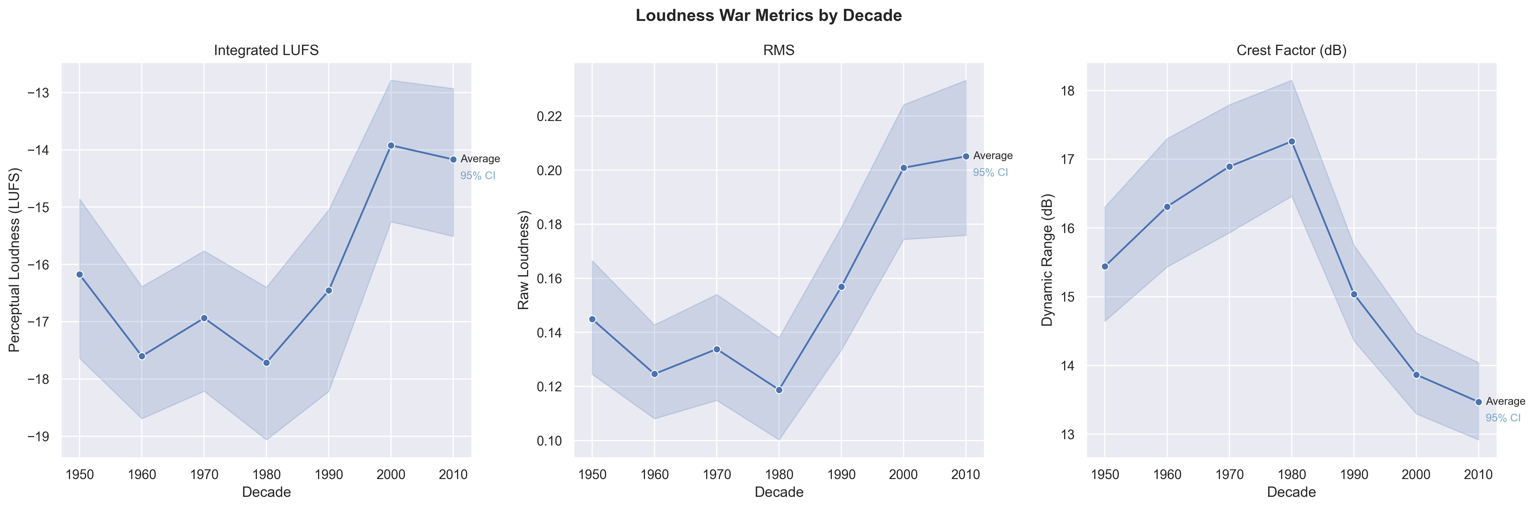 We observe a dramatic increase in RMS energy over time, especially from the 1990s onward, consistent with the “loudness war” phenomenon in modern production. Three complementary metrics capture the loudness war's fingerprint across decades. RMS measures raw loudness, LUFS (Loudness Units Full Scale) uses RMS but weighs mid-range frequencies as louder than bass or treble to more accurately represent perceived loudness. Crest factor measures the ratio between peak amplitude and RMS, which trends downward as a direct result of compression, a result of the loudness war. According to Sound on Sound, research analyzing over 4,500 tracks found that average loudness rose by roughly 5dB between the 1970s and 2011 (when the article was written), with crest factor falling by 3dB from the 1980s onward [1].