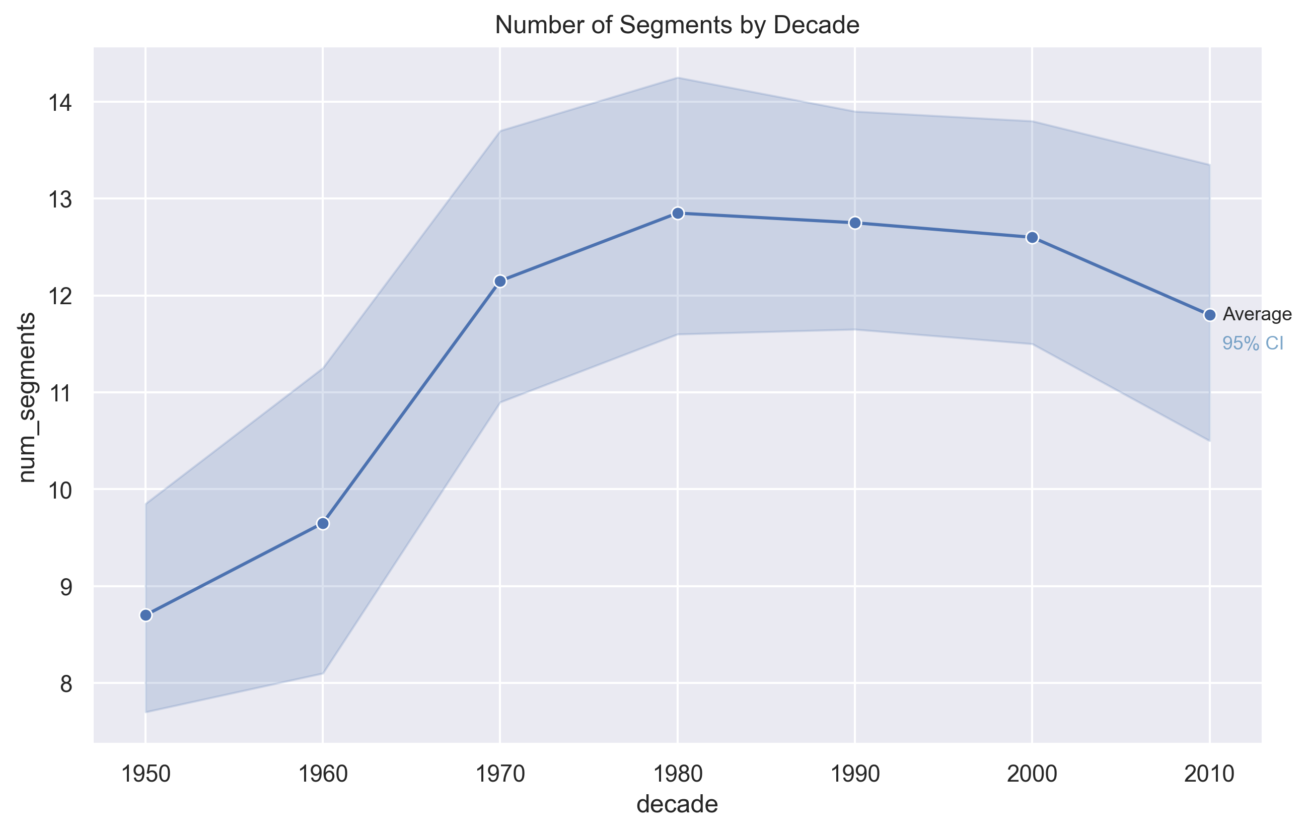 The number of structural segments per song increased from the 1950s through the 1980s, suggesting growing structural complexity during that period. In more recent decades, the number of segments slightly declines, indicating a modest simplification of song structure. The MSAF algorithm uses a similarity matrix to determine how similar certain sections of each song is to the rest of the songs, and the most different areas are the section boundaries. A low number of segments means the structure is more simple, and a high number means it's more complex.